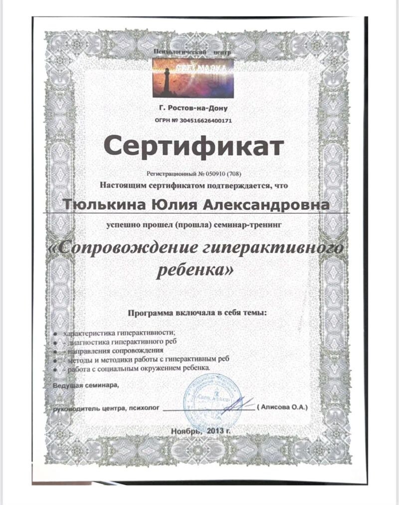 - Психологический центр «Свет маяка», семинар-тренинг «Сопровождение гиперактивного ребенка», 2013 г.
