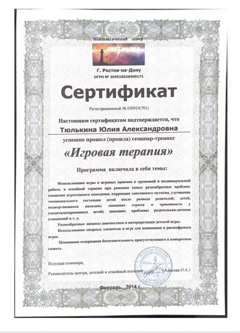 - Психологический центр «Свет маяка», игровая терапия, 2014 г.