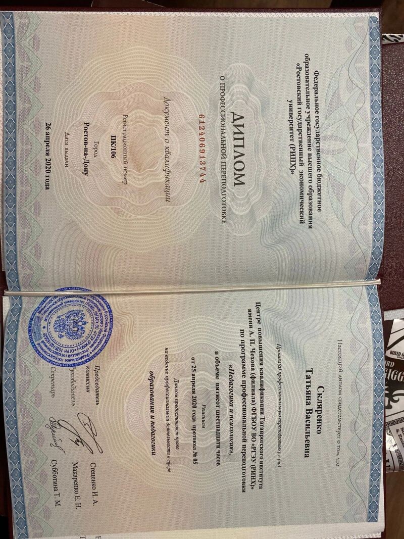 - Ростовский государственный экономический университет, профессиональная переподготовка по программе «Педагогика и психология», 2020 г.