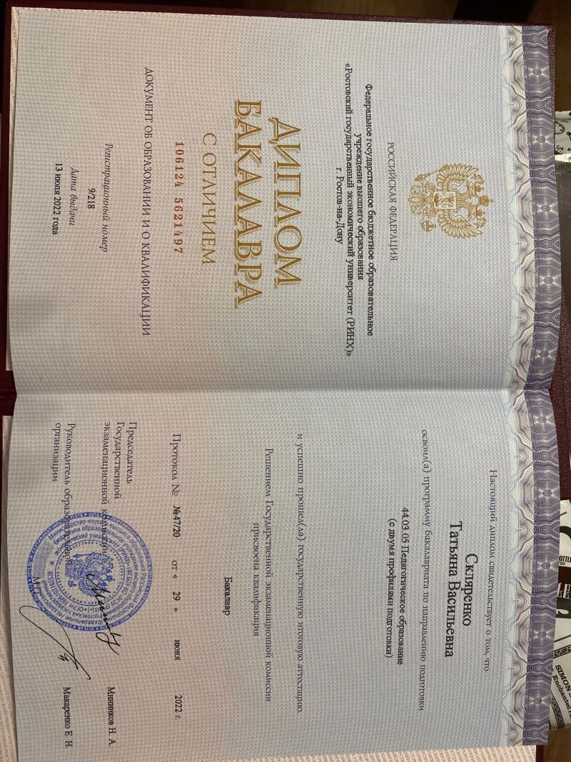- Ростовский государственный экономический университет, педагогическое образование (с двумя профилями подготовки), бакалавр, 2017–2022 гг.