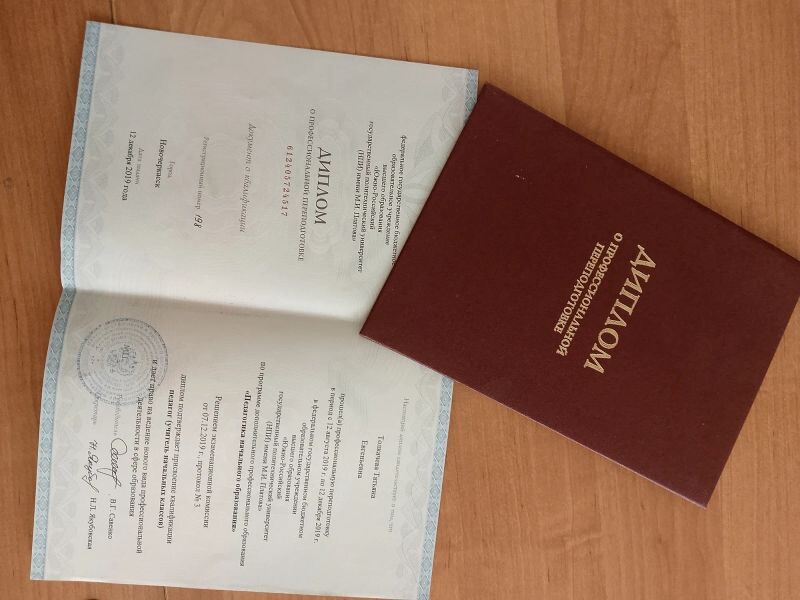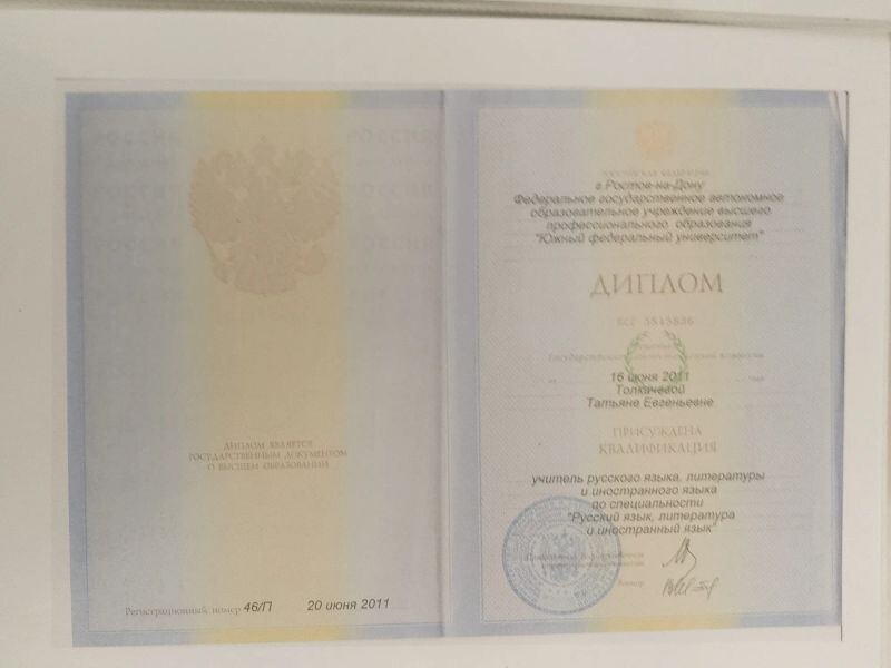 - ЮФУ, отделение словесности и лингвистики, специальность – русский язык, литература и иностранный язык (2011 г.).