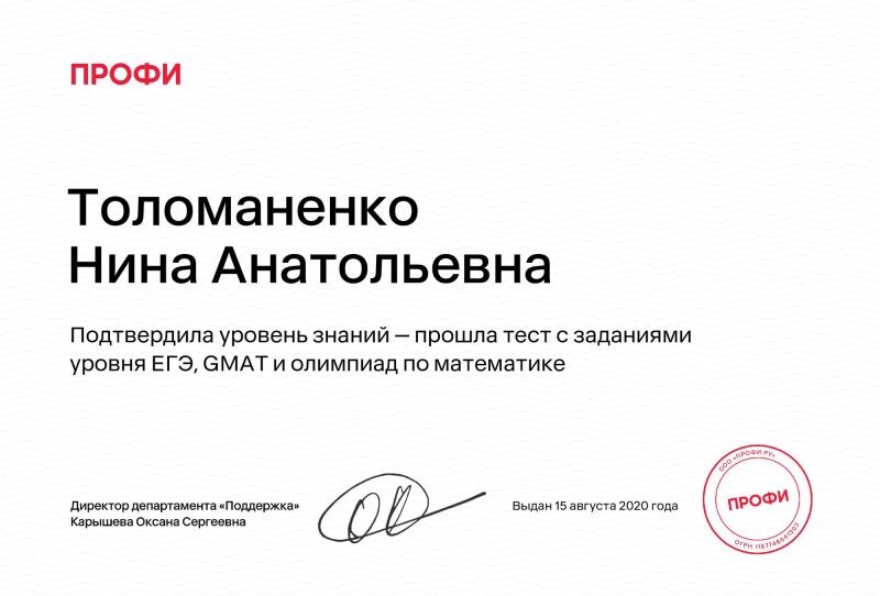 Благодаря профессионализму Нины Анатольевны, мой ребенок стал успешнее в изучении математики. Оценки в школе значительно улучшились. Нина Анатольевна имеет индивидуальный подход к каждому ученику. Мы довольны результатами и сотрудничеством с таким квалифицированным репетитором.