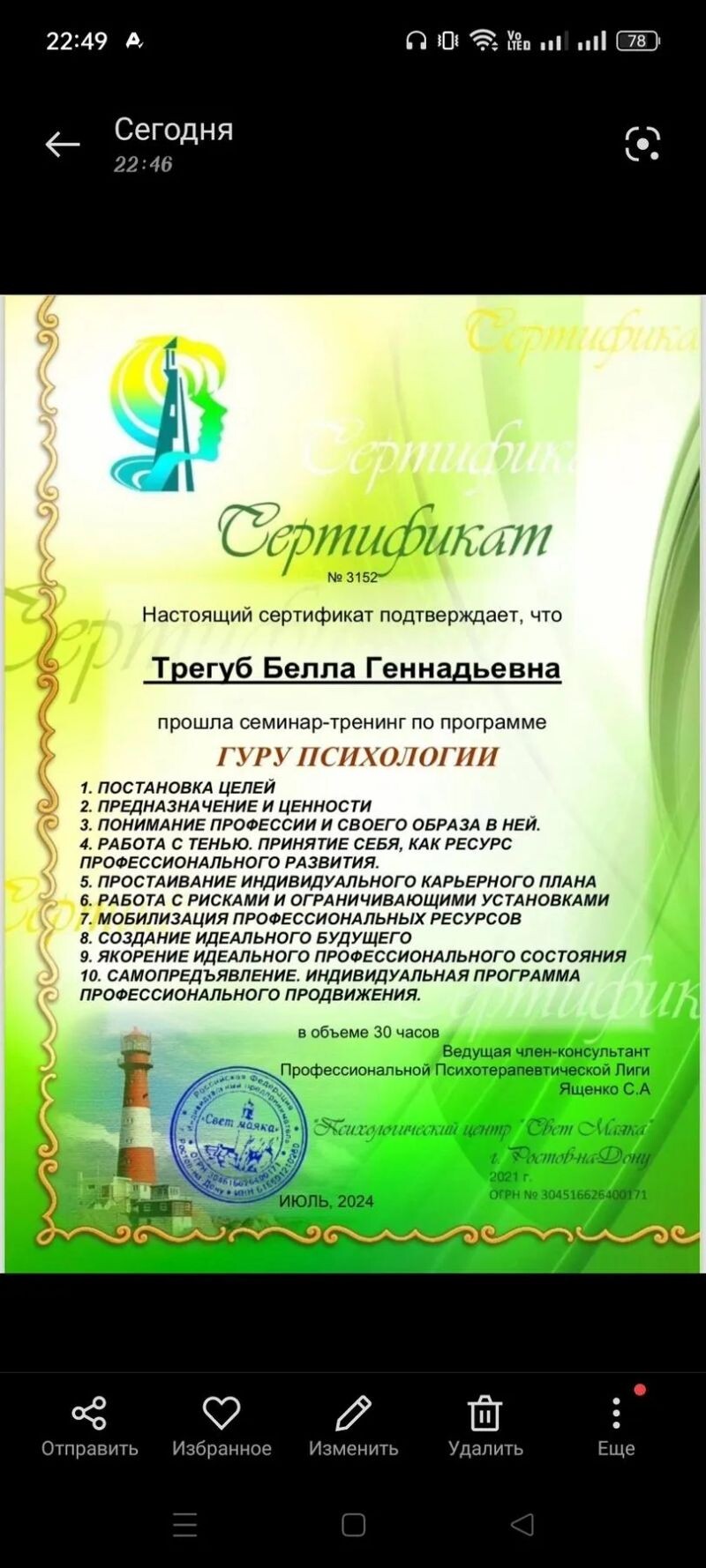 - ООО «Учебный центр „ПРОФИ“» ЛОД, программа «Школа интегративной позитивной ресурсно-ориентированной психологии Светланы Александровны Ященко „Свет Маяка“. Современная психология детства и подросткового возраста, практический курс», 2020–2024 гг.