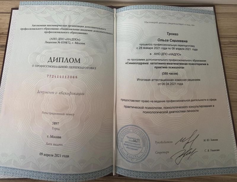 - Национальная академия дополнительного профессионального образования, обучение по программе «Символдрама: кататимно-имагинативная психотерапия в практике психолога», 2021 г.