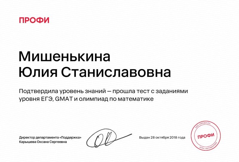 - Подтвердила уровень знаний — Прошла тест с заданиями уровня ЕГЭ, GMAT и олимпиад по математике (с 2018 г.).