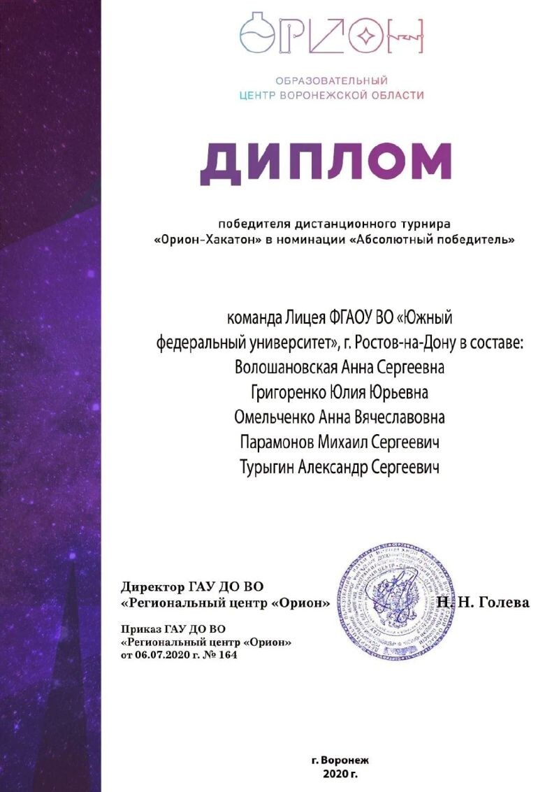 - Победитель дистанционного турнира «Орион-Хакатон» в номинации «Абсолютный победитель», 2020 г.