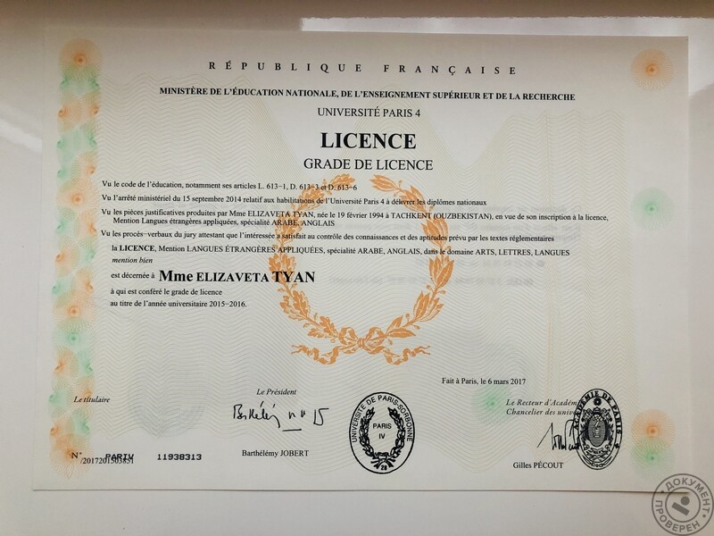 - Université Paris IV (Paris Sorbonne), Langues étrangères appliquées, specialité arabe, anglais; Факультет филологии Парижского Университета Сорбонна, прикладные иностранные языки по специальности "арабский и английский", 2013–2016 гг.