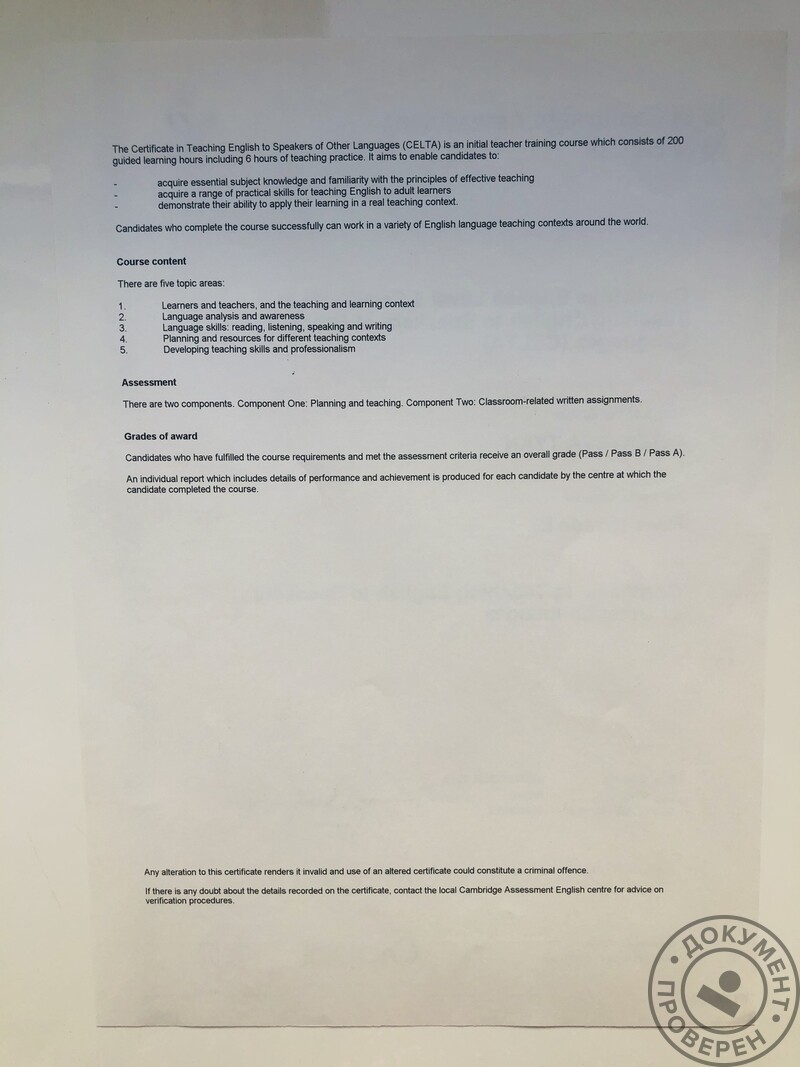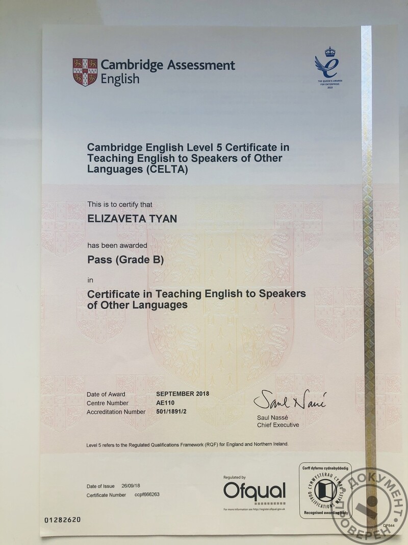 - Cambridge English Level 5 Certificate in Teaching English to Speakers of Other Languages (CELTA), 2018 г.