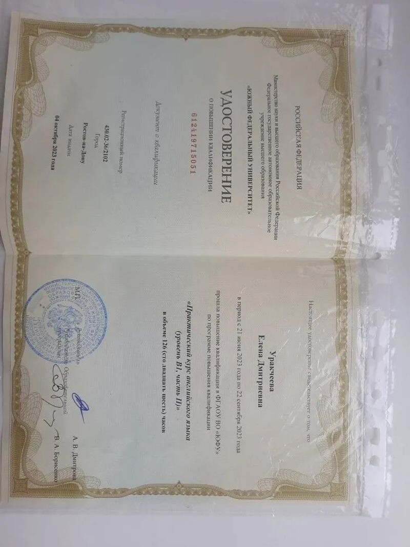- Южный федеральный университет, программа «Практический курс английского языка, уровень В1», 2023 г.