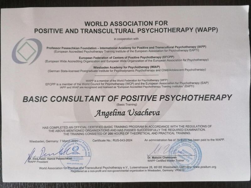 - WORLD ASSOCIATION FOR POSITIVE AND TRANSCULTURAL PSYCHOTHERAPY (WAPP), Другое, 200 часов, 2023–2024 гг.