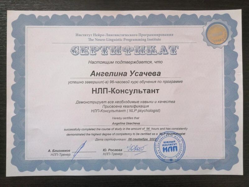- Южный институт НЛП, Другое, 96 часов, 2022–2022 гг.