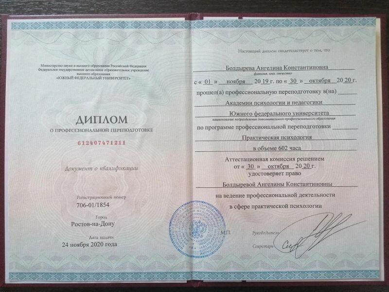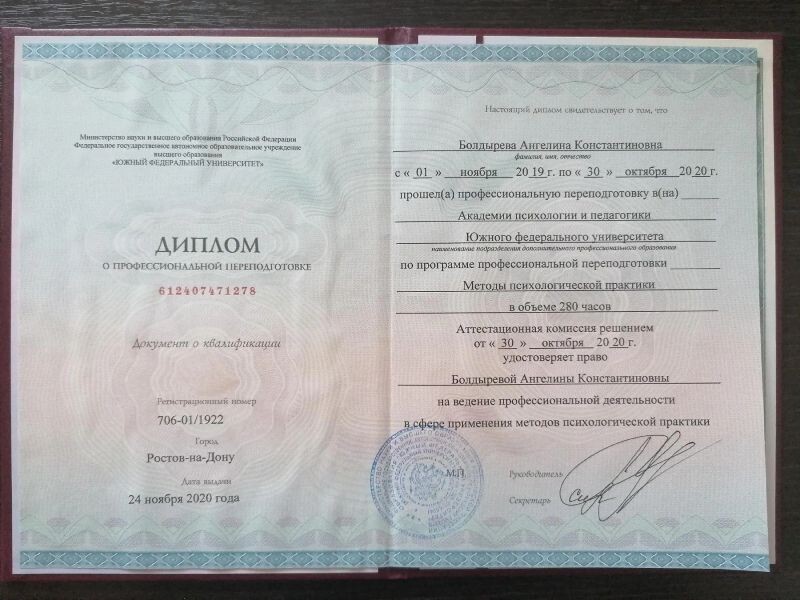 - Академия психологии и педагогики Южного федерального университета, профессиональная переподготовка по программе «Методы психологической практики», 2019–2020 гг.