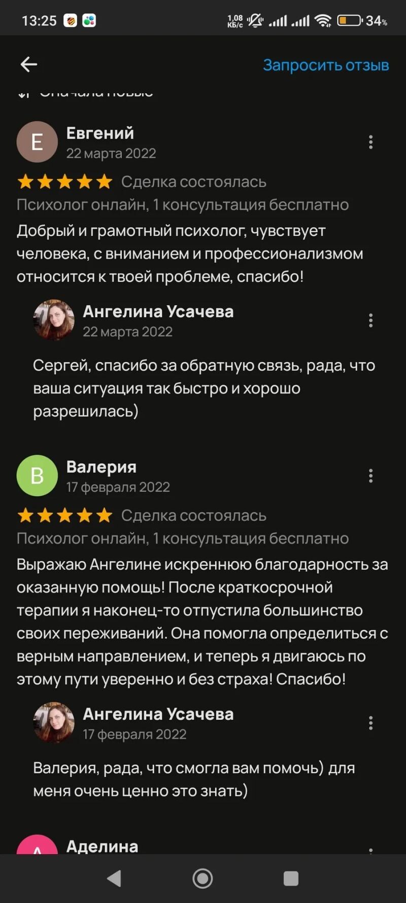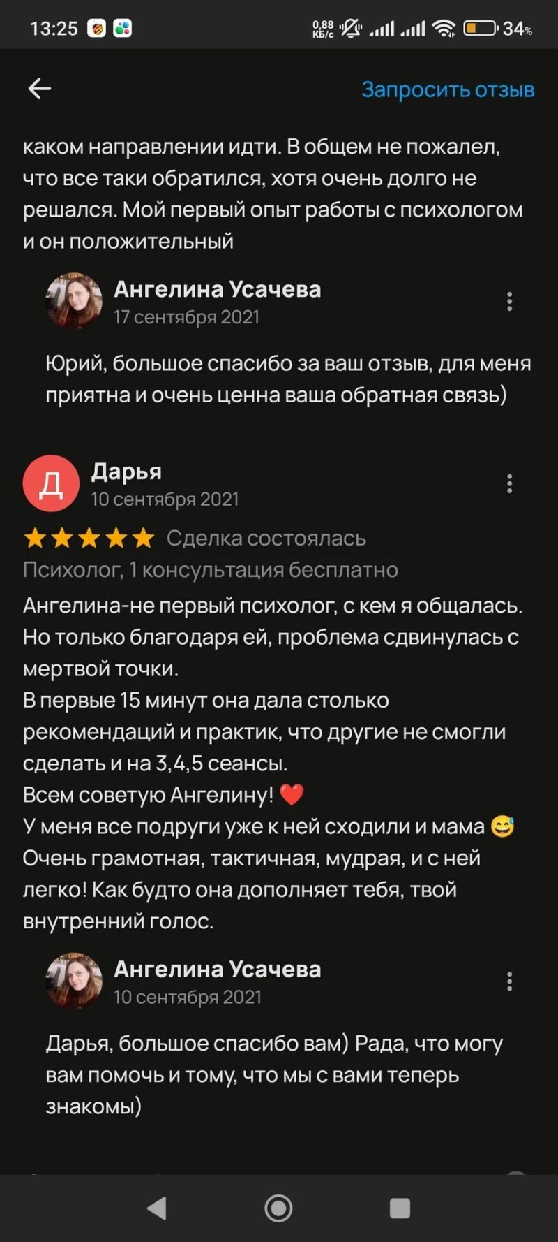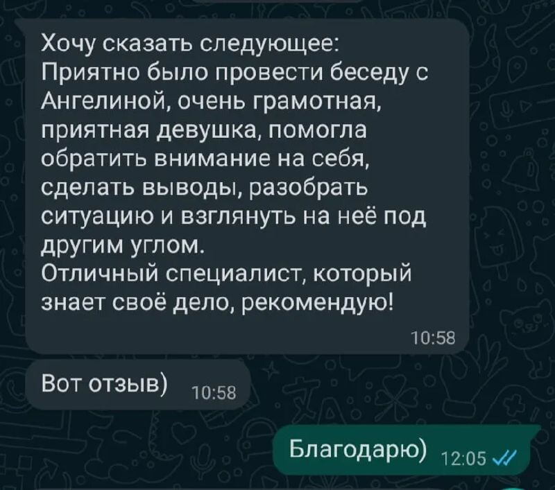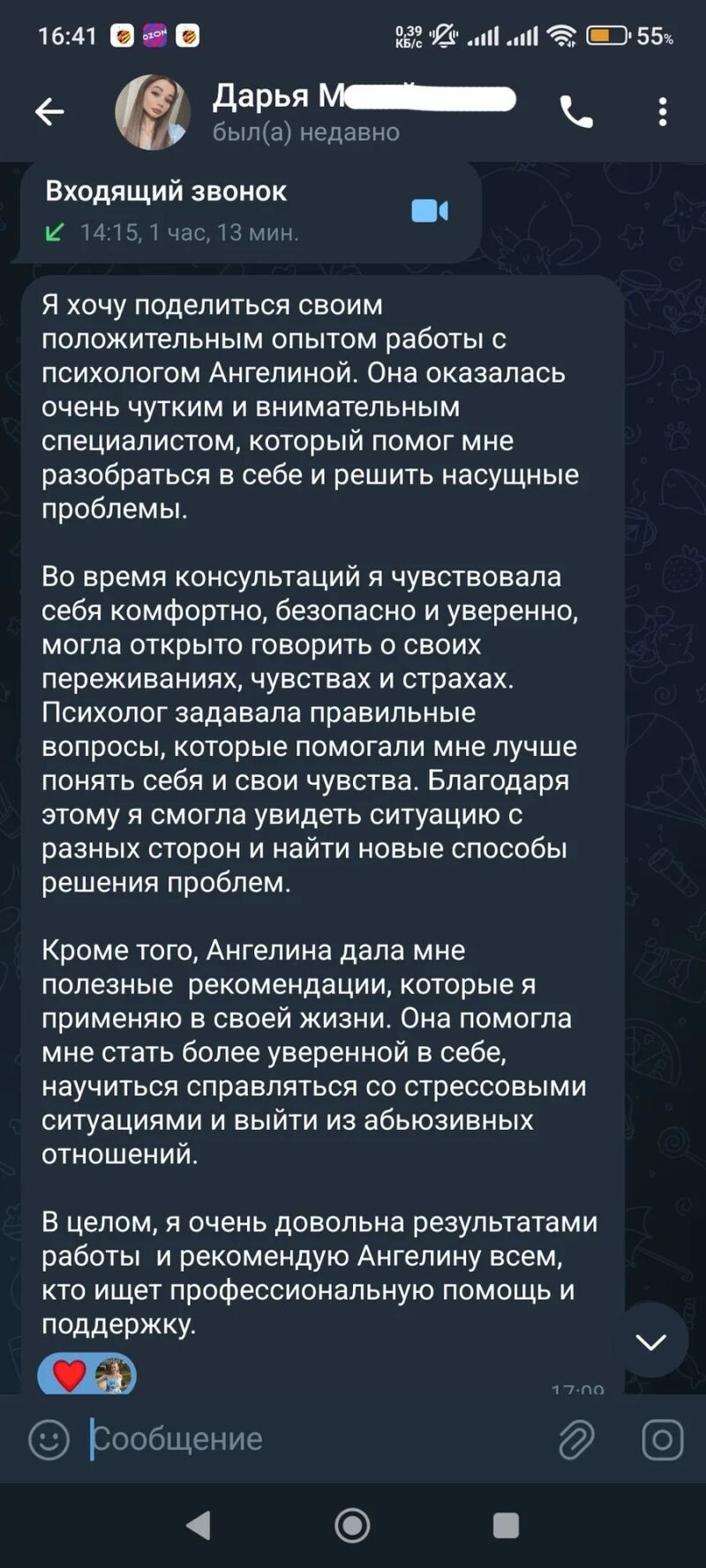 Обратилась к Ангелине с проблемой в отношениях с партнером. До этого какое-то время я работала с другим психологом, но уже сейчас могу сказать, что работа с Ангелиной для меня более эффективная. С первой консультации она стала давать мне упражнения на дом, что очень помогает подумать о себе и про других, взглянуть на проблему со стороны. Для меня очень важно в работе, чтобы психолог подсвечивал важные для меня моменты, если этого не происходит или же я не чувствую, что во мне это откликается, у меня пропадает мотивация. С Ангелиной очень комфортно, так как в плане меня и моих запросов она очень четко и чутко обращает внимание на эти моменты, которые для меня очень важны. Я считаю, что после консультаций есть положительная динамика в моих внутренних проблемах и ощущениях, а также в отношениях с партнером. Рекомендую специалиста Ангелину!