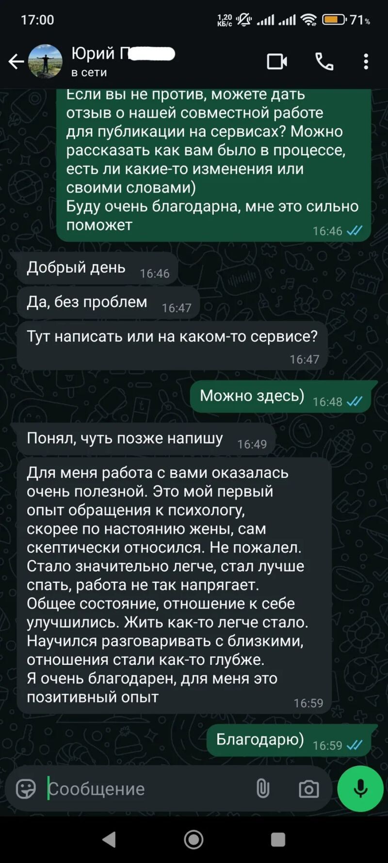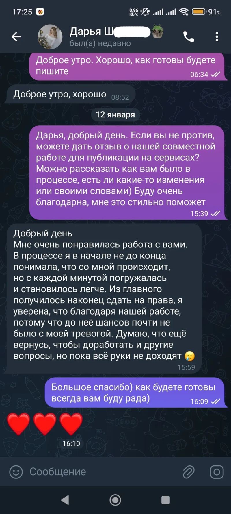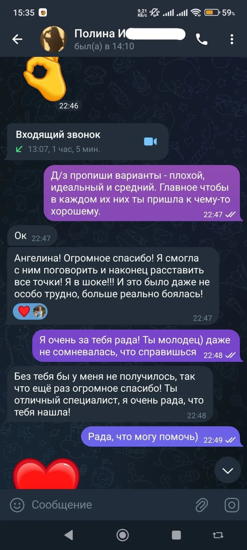 Обратилась к Ангелине с проблемой в отношениях с партнером. До этого какое-то время я работала с другим психологом, но уже сейчас могу сказать, что работа с Ангелиной для меня более эффективная. С первой консультации она стала давать мне упражнения на дом, что очень помогает подумать о себе и про других, взглянуть на проблему со стороны. Для меня очень важно в работе, чтобы психолог подсвечивал важные для меня моменты, если этого не происходит или же я не чувствую, что во мне это откликается, у меня пропадает мотивация. С Ангелиной очень комфортно, так как в плане меня и моих запросов она очень четко и чутко обращает внимание на эти моменты, которые для меня очень важны. Я считаю, что после консультаций есть положительная динамика в моих внутренних проблемах и ощущениях, а также в отношениях с партнером. Рекомендую специалиста Ангелину!