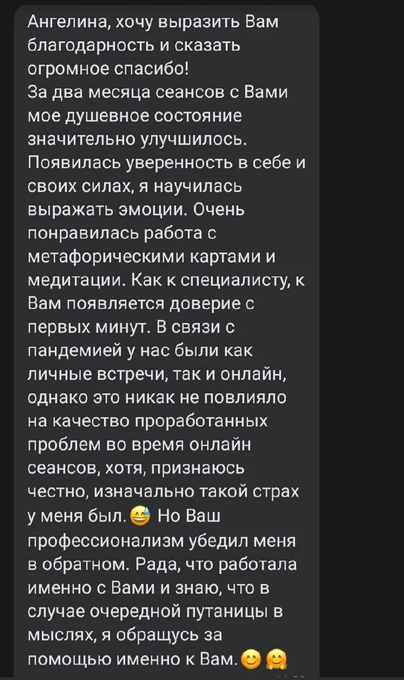 Мне нравится, что на сессии с Ангелиной можно быть открытой и не бояться проявить эмоции, будь то слезы или смех. Плюс она дает задания, которые интересно выполнять. Но все по желанию и максимально экологично по отношению к себе. Обратная связь очень важна при общении с психологом. Ты понимаешь, что тебя не просто слушают, но и вовлечены в твои проблемы. Время пролетает незаметно, а настроение улучшается. Однозначно рекомендую Ангелину!