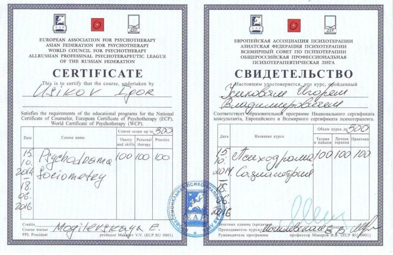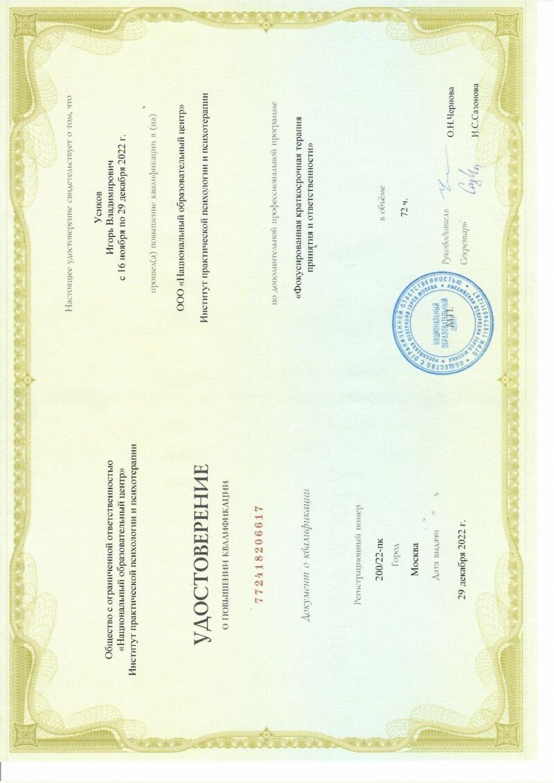 - ООО «Национальный образовательный центр» Институт практической психологии и психотерапии, программа «Фокусированная краткосрочная терапия принятия и ответственности», 2022 г.