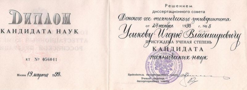 - Донской государственный технический университет, кандидат технических наук, 1996–1999 гг.