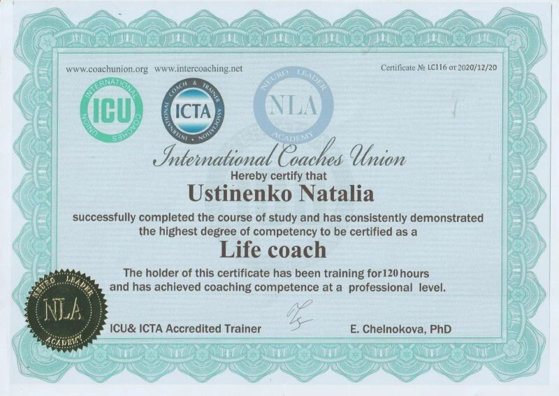 - INTERNATIONAL COACHES UNION, Коучинг — 3 года.