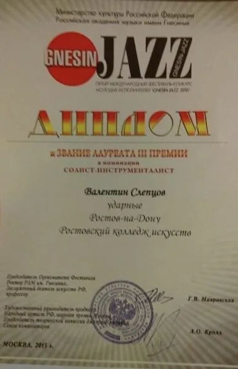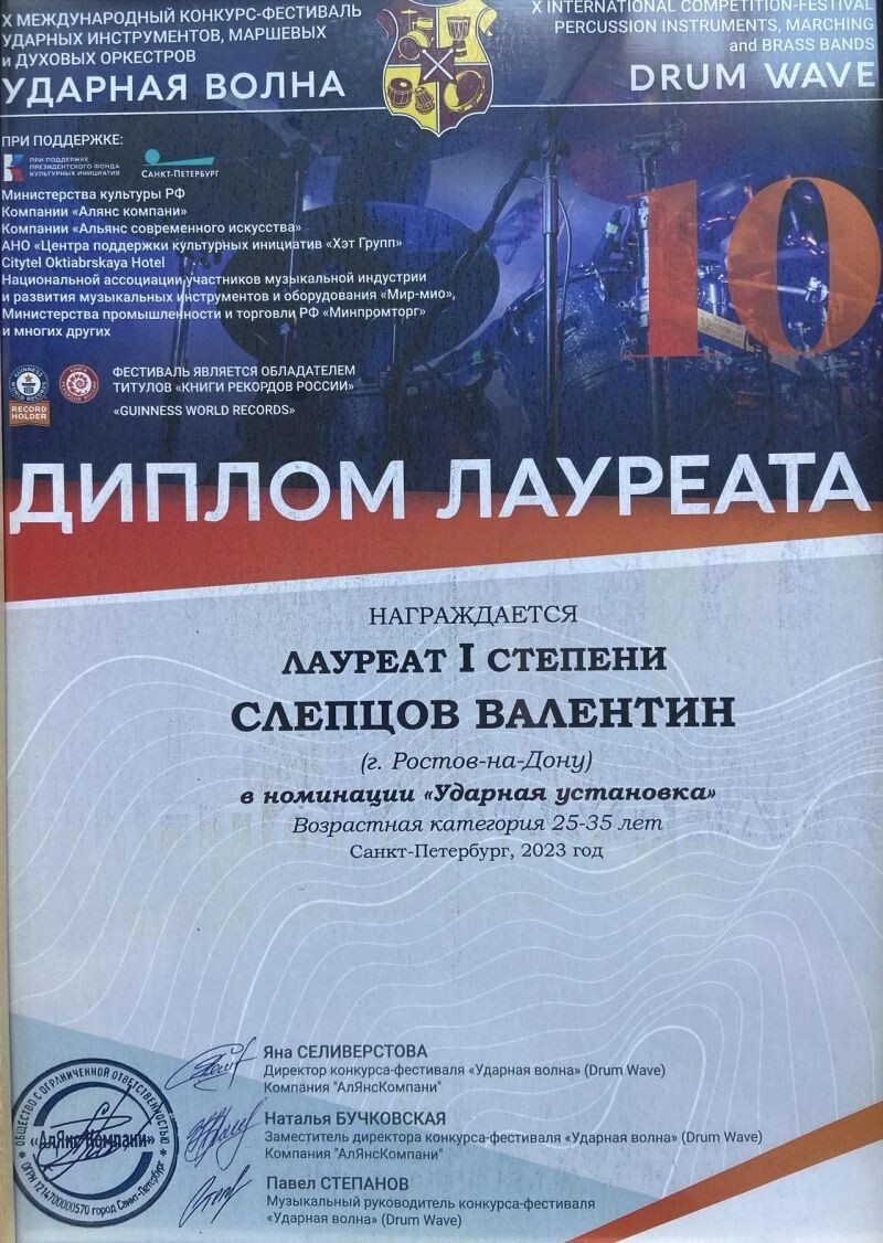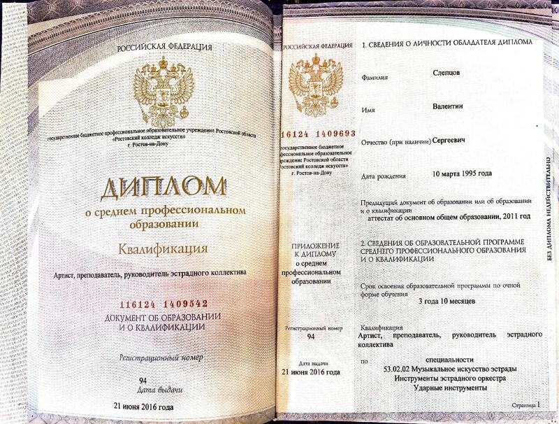 - Ростовский колледж искусств,музыкальное искусство эстрады,класс ударных инструментов, 2012–2016 гг.