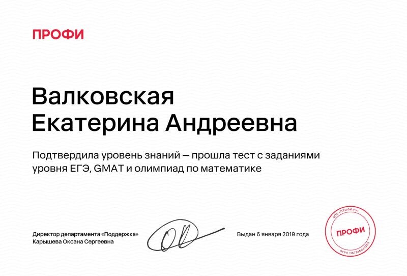 - Подтвердила уровень знаний — Прошла тест с заданиями уровня ЕГЭ, GMAT и олимпиад по математике (с 2019 г.).