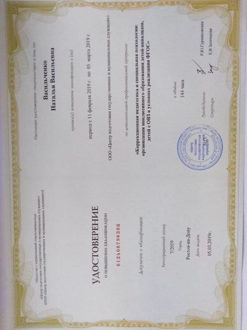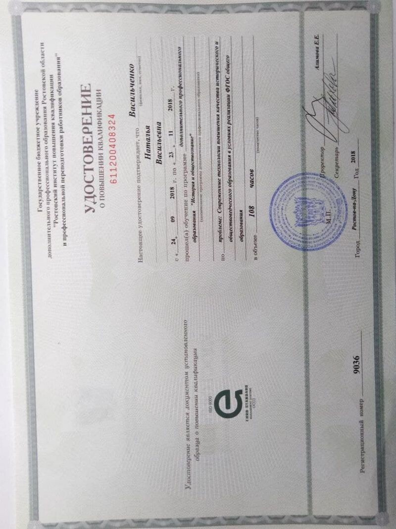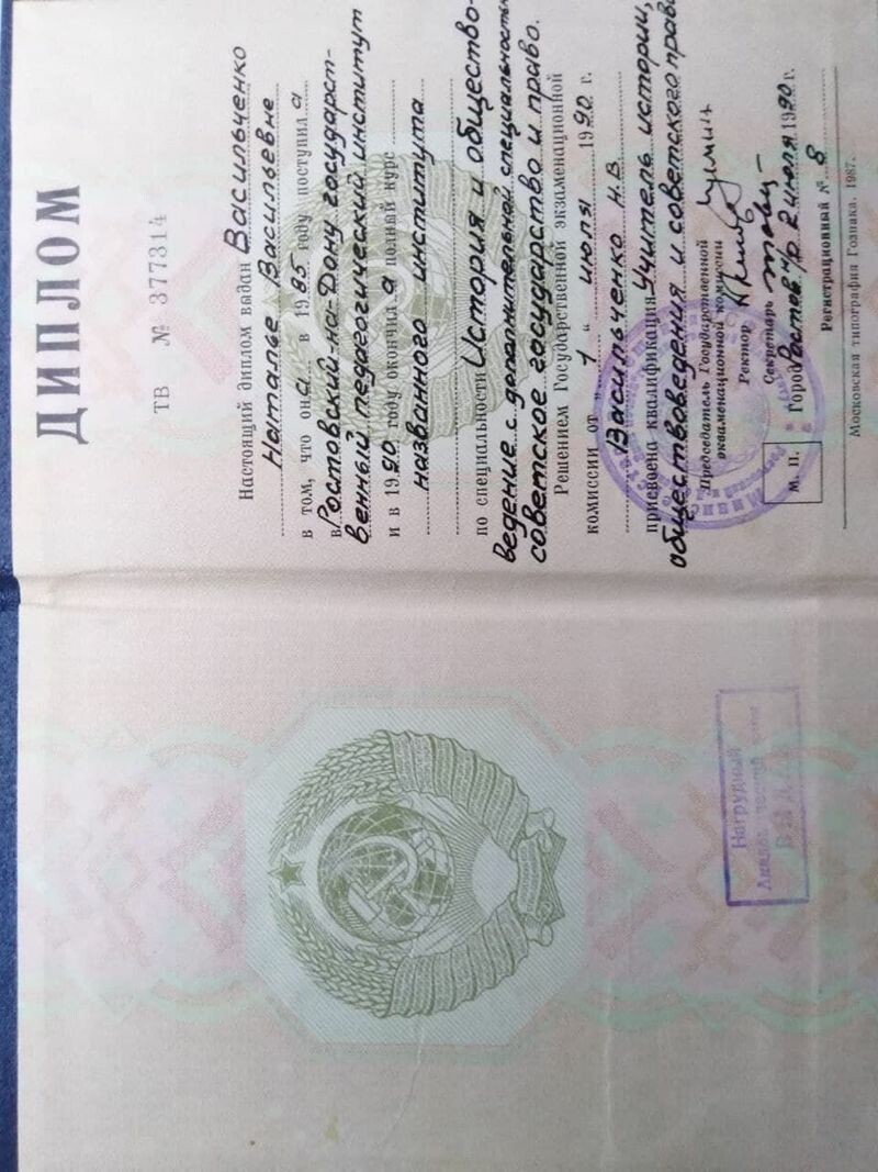 - Ростовский государственный педагогический университет, исторический факультет, учитель истории, обществознания и советского права, 1985–1990 гг.
