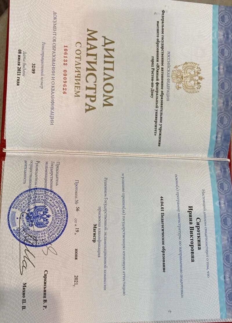 - Южный Федеральный Университет, ИФЖиМКК, Педагогическое образование, 2019–2021 гг.