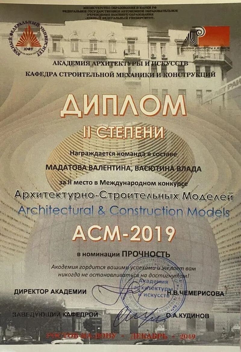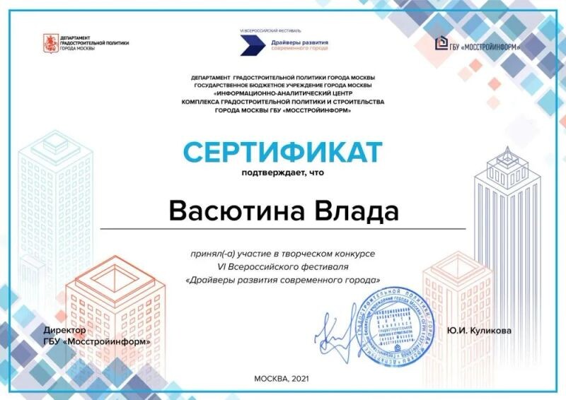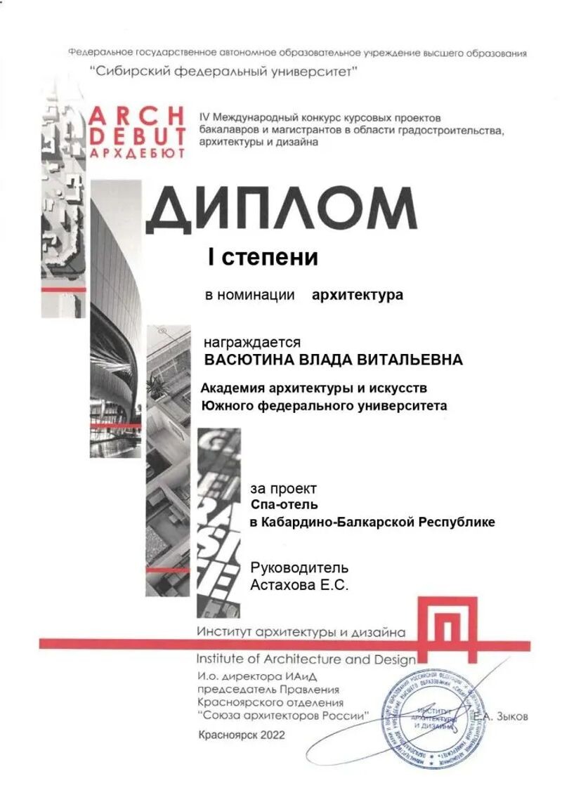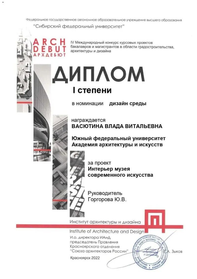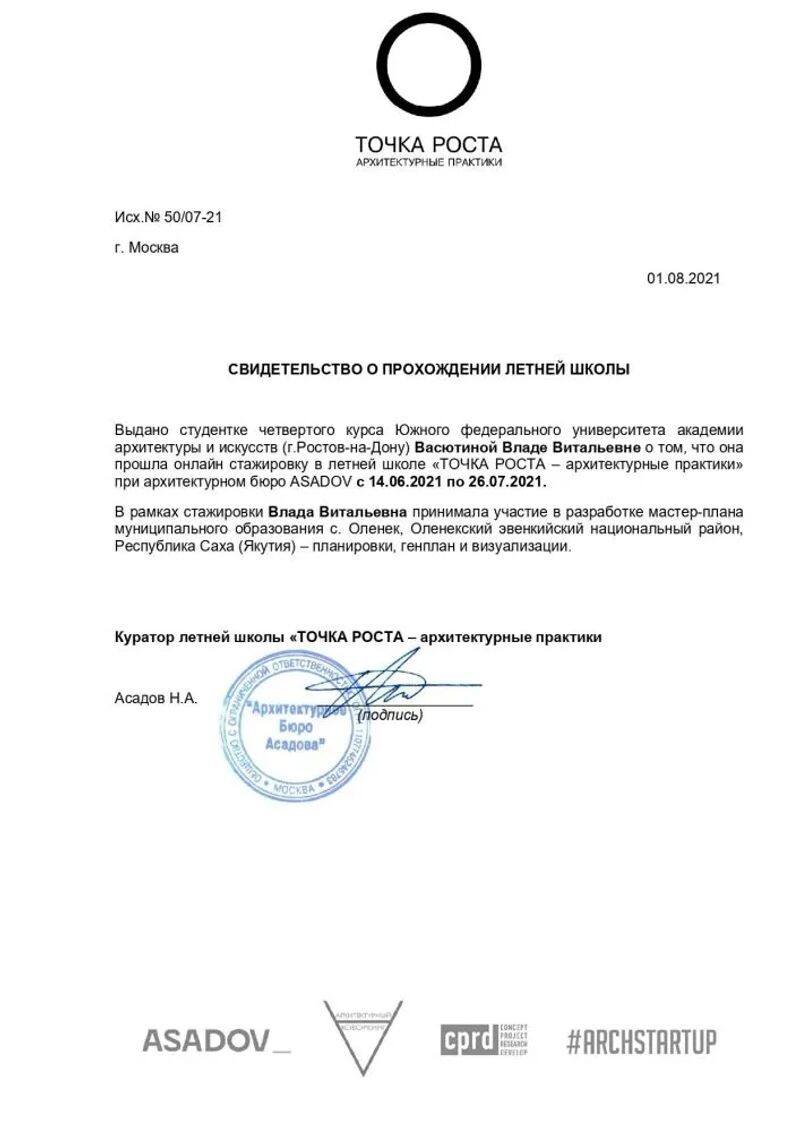 - Сертификат о прохождении практики в архитектурном бюро «ASADOV» г. Москва (с 2021 г.).