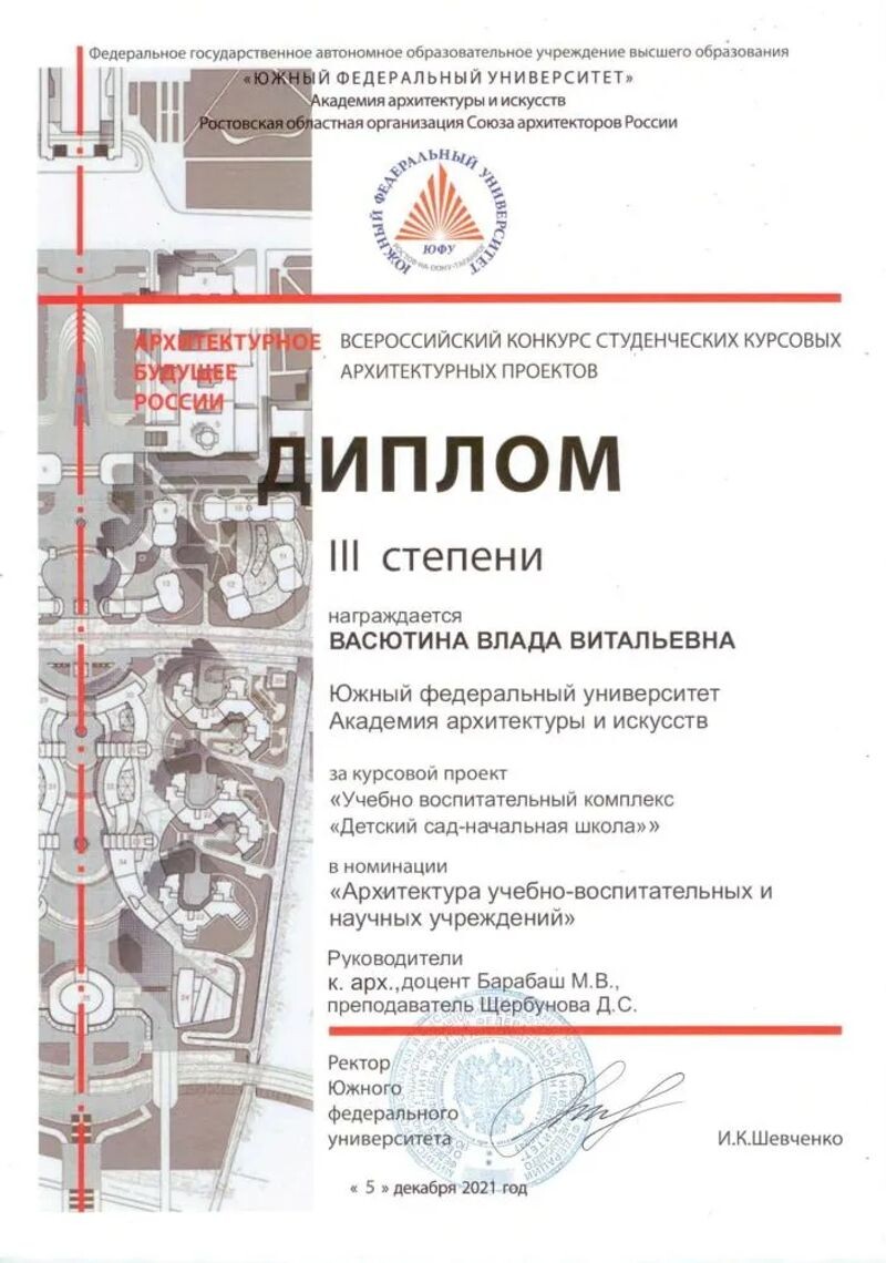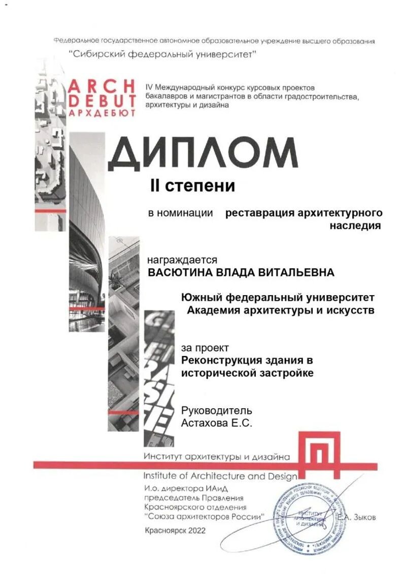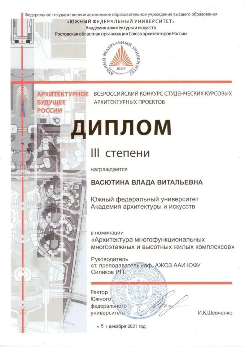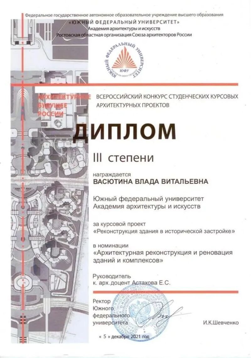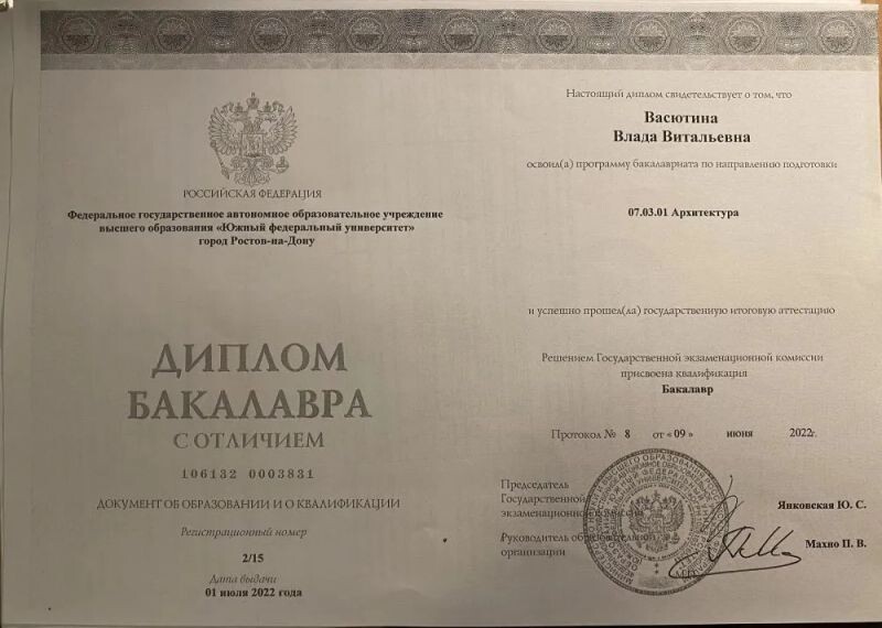- Южный Федеральный Университет г.Ростов-на-Дону. Архитектура. Бакалавр. Диплом с отличием, 2017–2022 гг.
