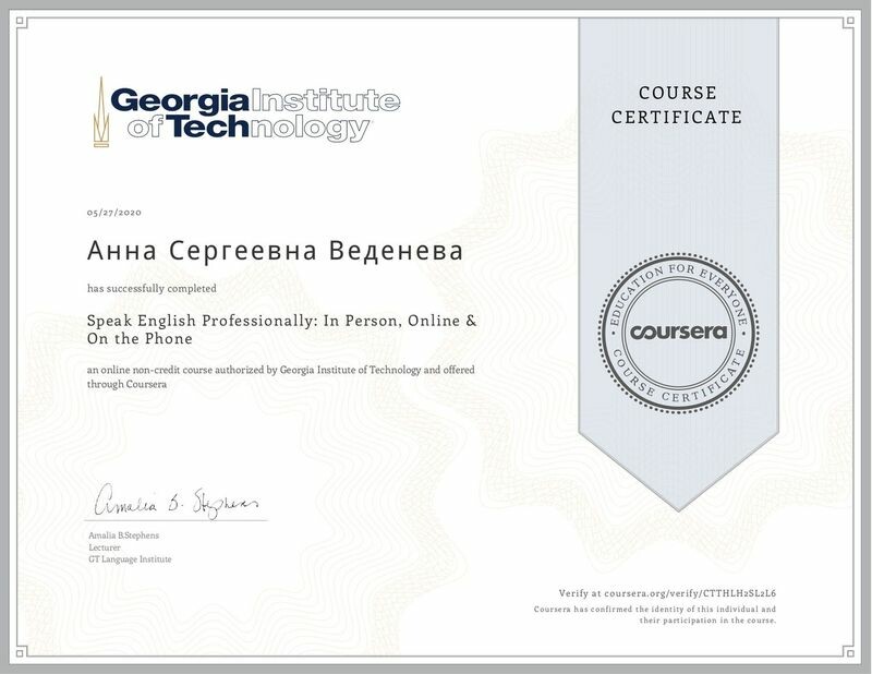 - Сертификат Технологического института Джорджии (США) «Speak English Professionally: In Person, Online & On the Phone», 2020 г.