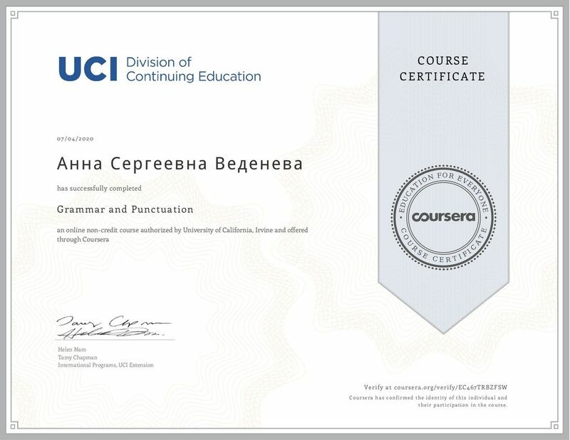 - Сертификат Калифорнийского университета в Ирвайне (США) «Grammar and Punctuation», 2020 г.