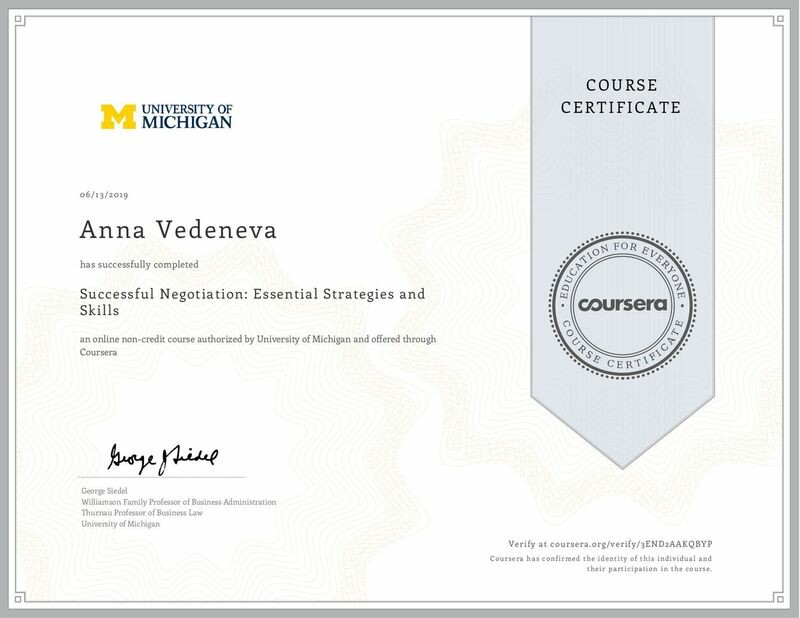 - Сертификат Мичиганского государственного университета (США), «Successful Negotiation: Essential Strategies and Skills», 2019 г.