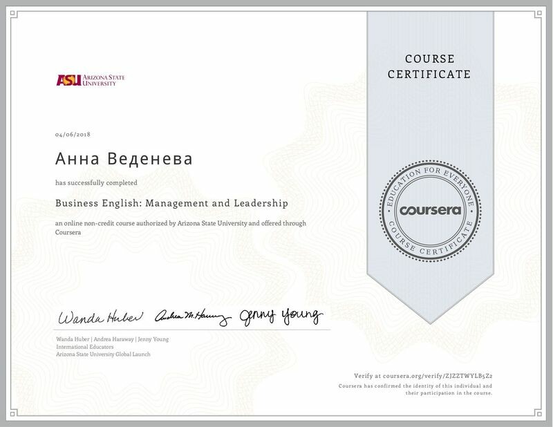 - Сертификат Университета штата Аризона (США), «Business English: Management and Leadership», 2018 г.