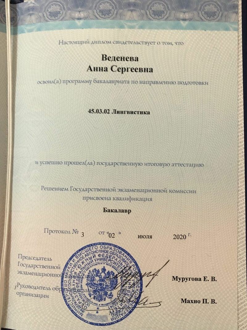 - Южный федеральный университет, ИФЖиМКК, направление — лингвистика, кафедра теории и практики иностранного языка, 2016–2020 гг.