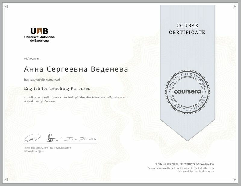 - Сертификат Автономного университета Барселоны, «English for Teaching Purposes», 2020 г.