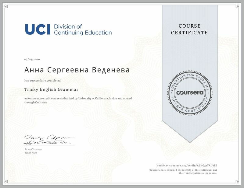 - Сертификат Калифорнийского университета в Ирвайне (США) «Tricky English Grammar», 2020 г.