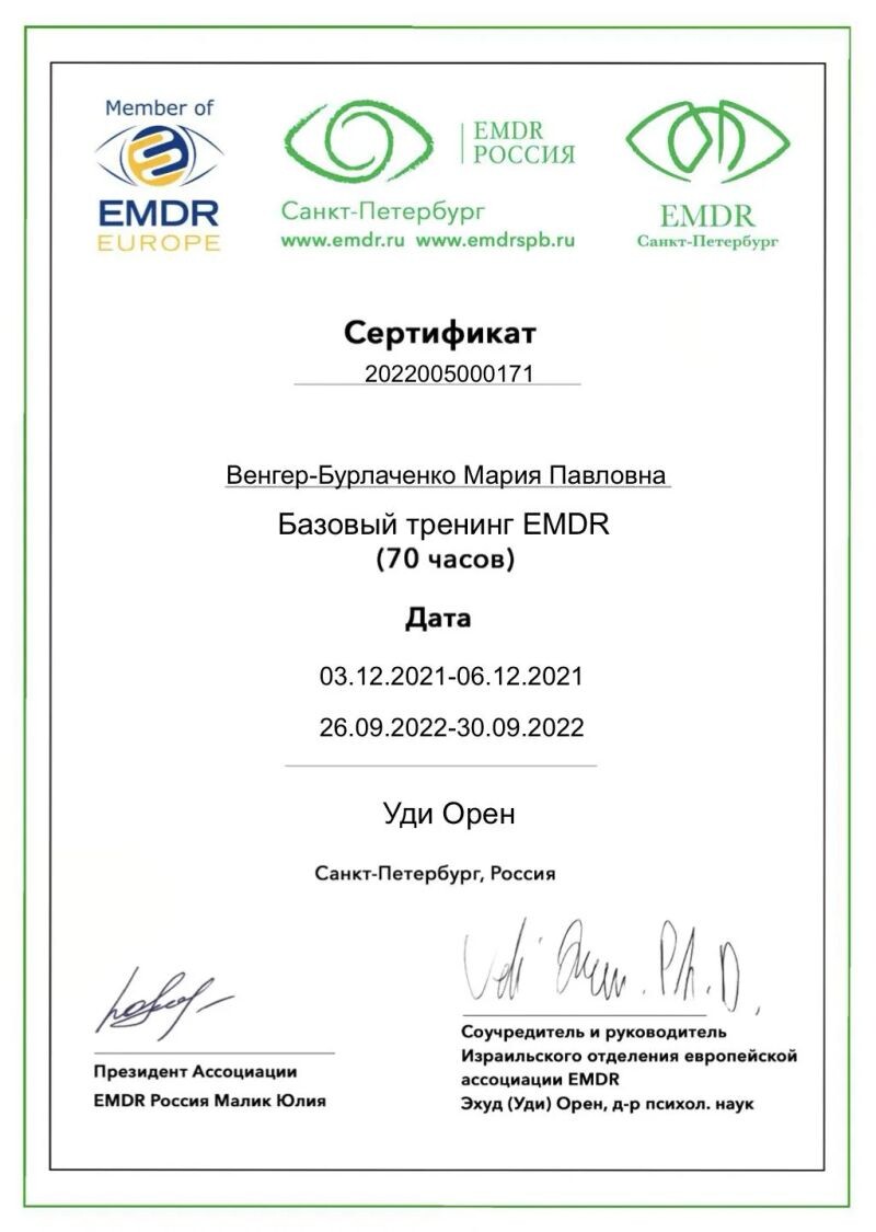 - Ассоциация EMDR Russia, EMDR, ДПДГ, 70 часов, 2021–2022 гг.