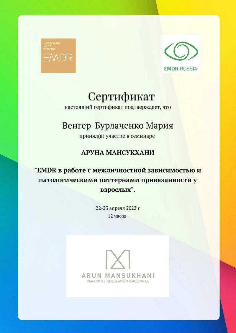 - Ассоциация EMDR Россия, Московский центр EMDR-терапии, сертификат «EMDR в работе с межличностной зависимостью и патологическими паттернами привязанности у взрослых», 2022 г.