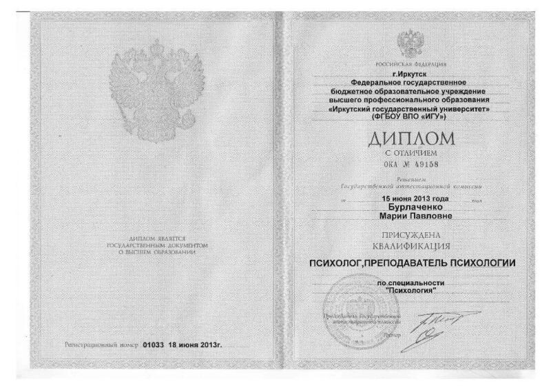 - Иркутский государственный университет, факультет психологии, специализация – клиническая психология, 2008–2013 гг.