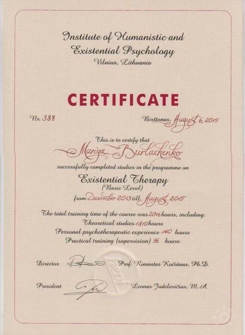 - Humanistins ir egzistencins psichologijos institutas (Birtone-Vilnius)/Институт гуманистической и экзистенциальной психологии, международная образовательная программа «Экзистенциальная психотерапия», 2013–2015 гг.