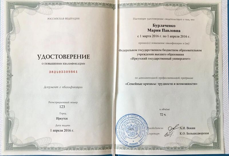- ФГБОУ ВО «Иркутский государственный университет», повышение квалификации по программе «Семейные кризисы: трудности и возможности», 2016 г.