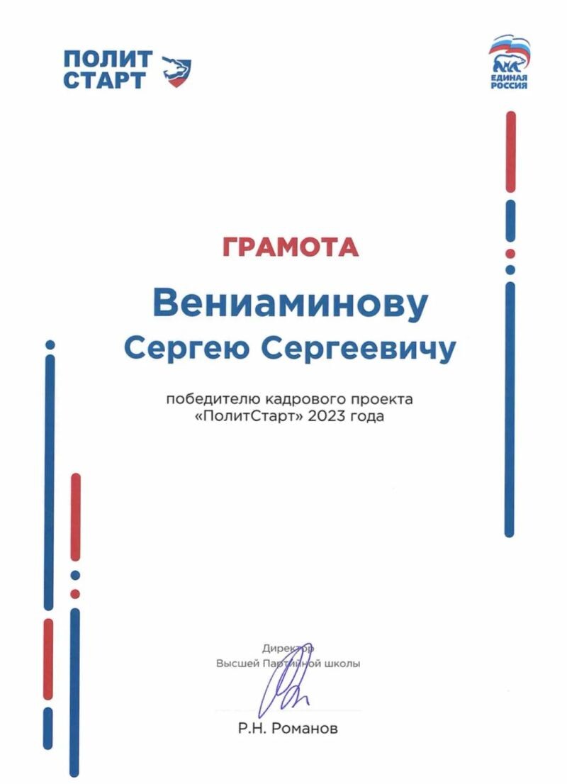 - Партия «Единая Россия», победитель кадрового проекта «Политстарт», 2023 г.