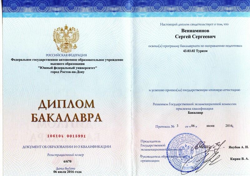 - ФГАОУ ВО «Южный федеральный университет», туризм, 2012–2016 гг.