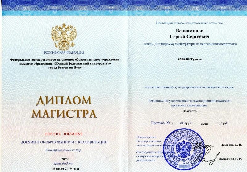 - ФГАОУ ВО «Южный федеральный университет», туризм, магистр, 2016–2019 гг.