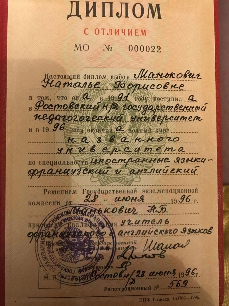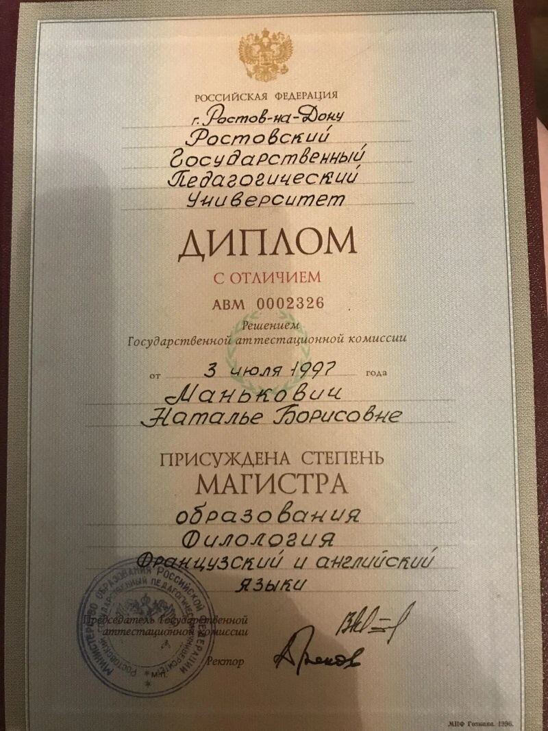- Ростовский государственный педагогический университет, диплом с отличием, магистр образования, филология французский и английский языки, 1996–1997 гг.