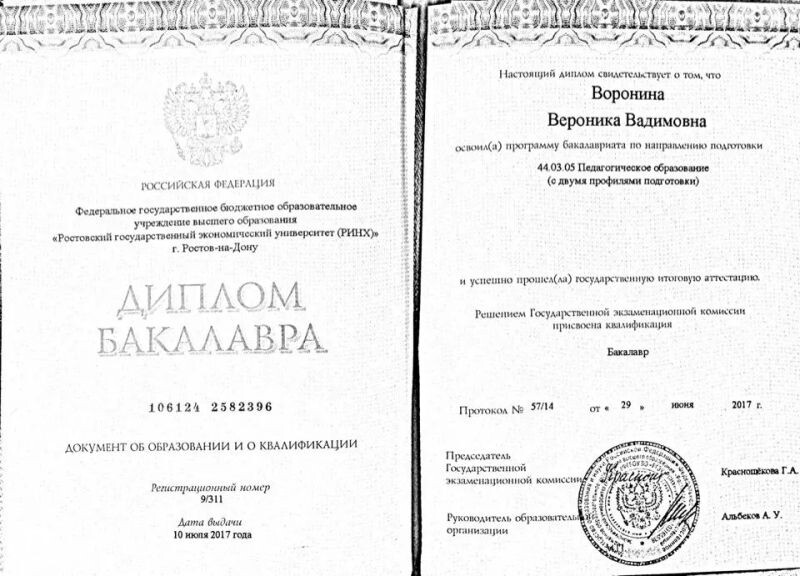 - РИНХ, педагогическое образование (с двумя профилями подготовки), диплом бакалавра, 2017 г.