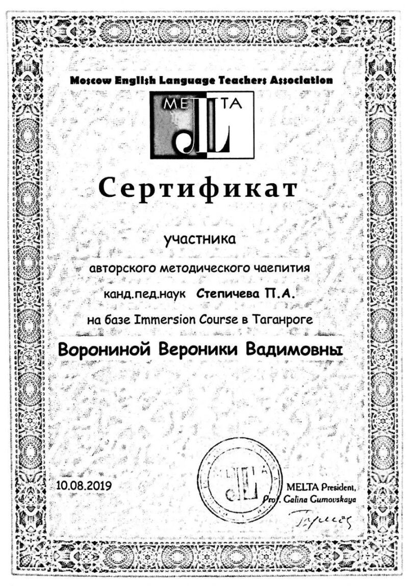 - Moscow English Language Teachers Association, Immersion Course, 2019 г.