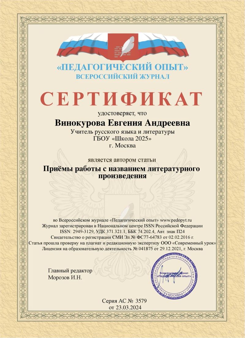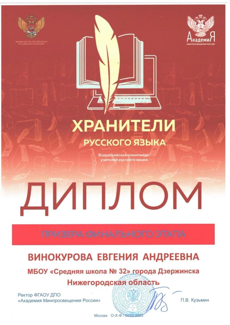 - Призёр Всероссийского этапа олимпиады "Хранители русского языка" (с 2022 г.).