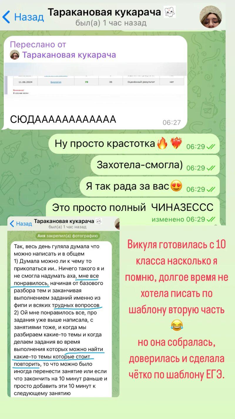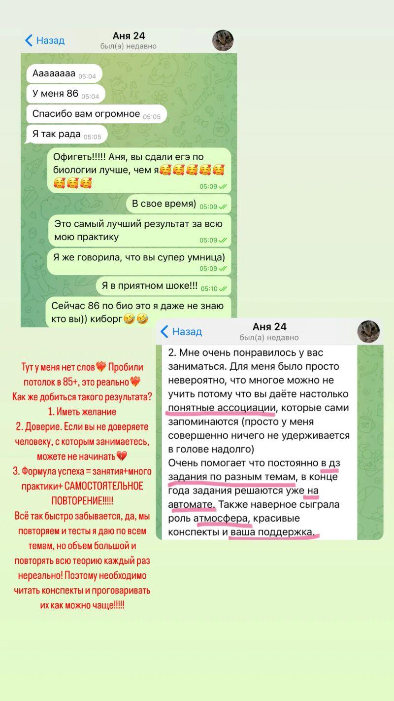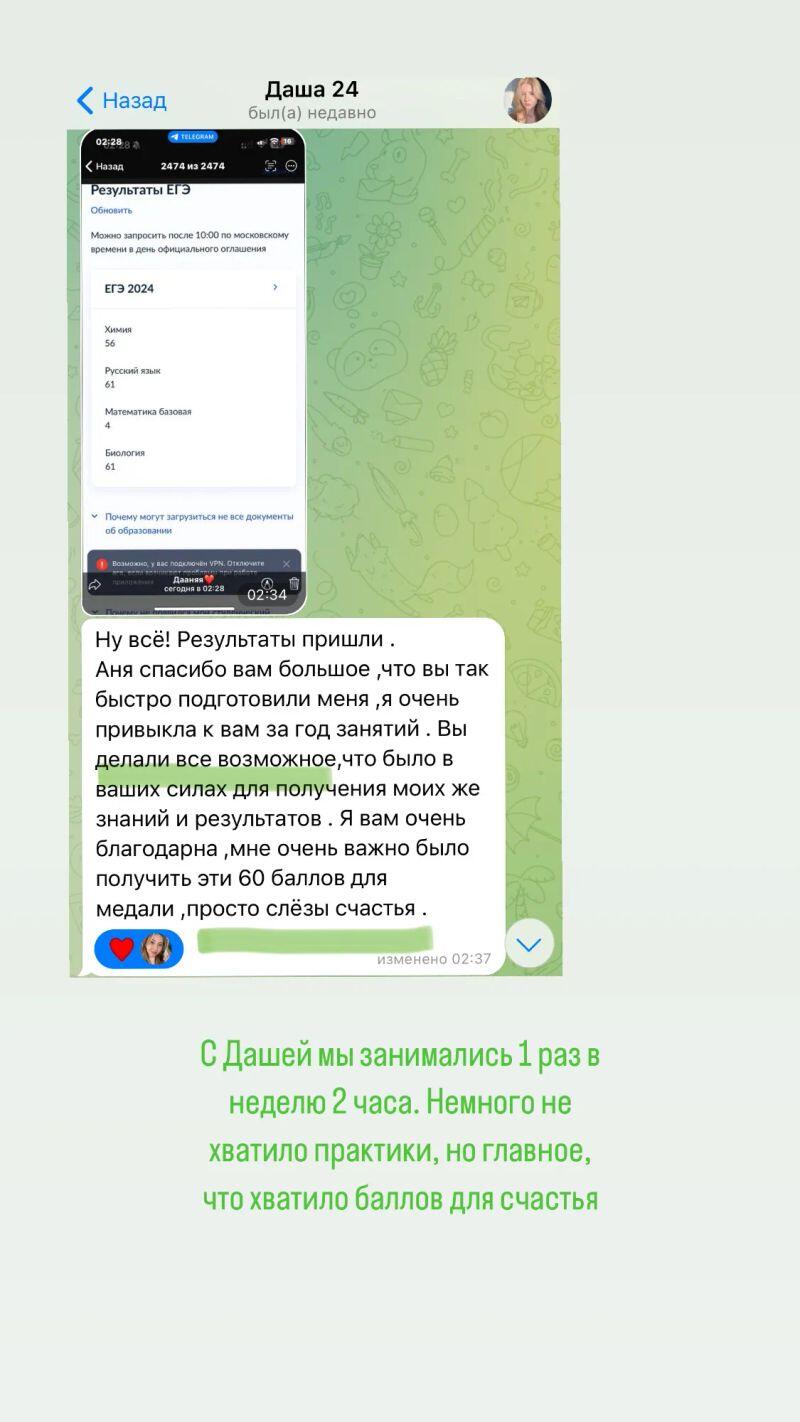 Я не занималась биологией с 10 класса и у нас её не преподавали в школе. Однако, Анна оказалась отличным преподавателем. За год подготовки к ЕГЭ я чувствовала уверенность на экзамене. Кроме знаний, я получила поддержку и общение с замечательным человеком. Она отлично объясняет и подстраивается под мои знания. Занятия удалось проводить дистанционно, но они были очень эффективными. После занятий с Анной моя уровень знаний существенно вырос! Если вы выбираете репетитора, то я однозначно рекомендую Анну!