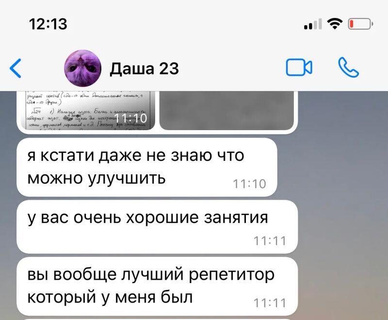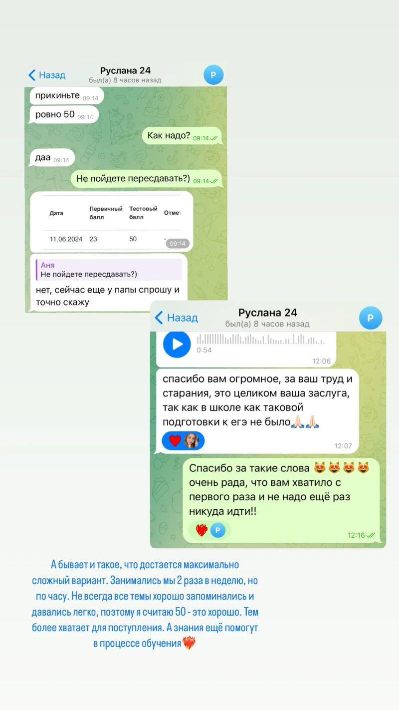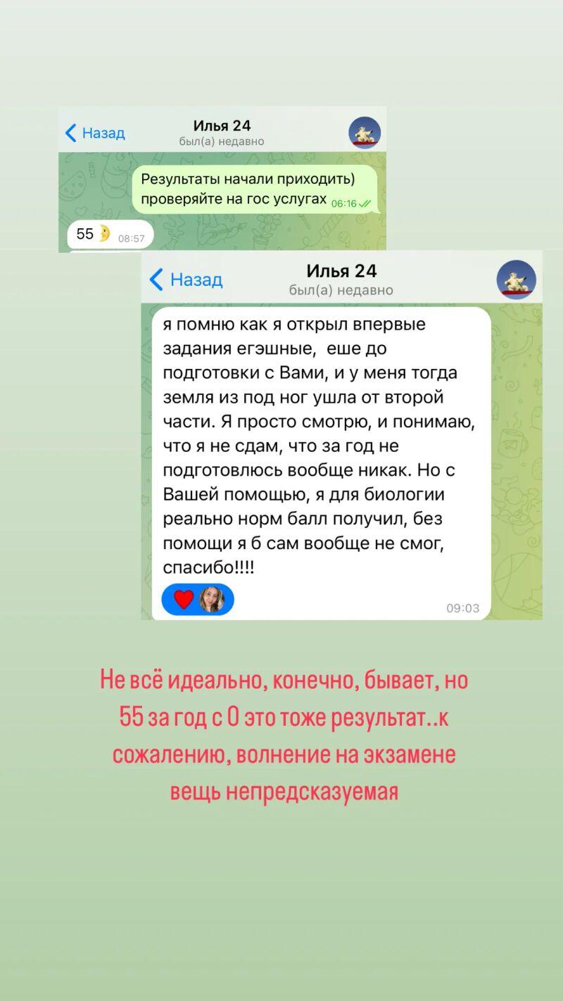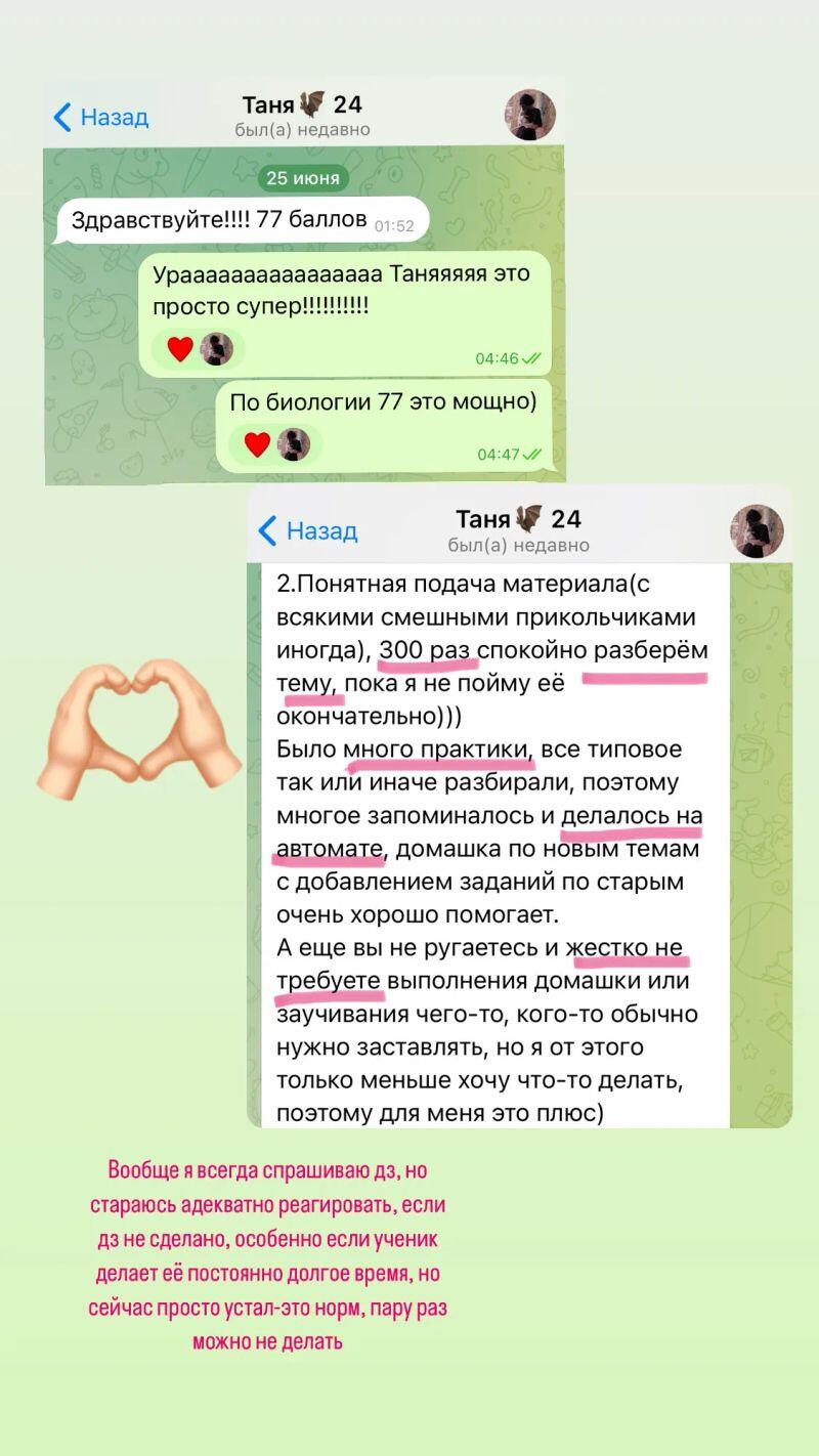 Я не занималась биологией с 10 класса и у нас её не преподавали в школе. Однако, Анна оказалась отличным преподавателем. За год подготовки к ЕГЭ я чувствовала уверенность на экзамене. Кроме знаний, я получила поддержку и общение с замечательным человеком. Она отлично объясняет и подстраивается под мои знания. Занятия удалось проводить дистанционно, но они были очень эффективными. После занятий с Анной моя уровень знаний существенно вырос! Если вы выбираете репетитора, то я однозначно рекомендую Анну!