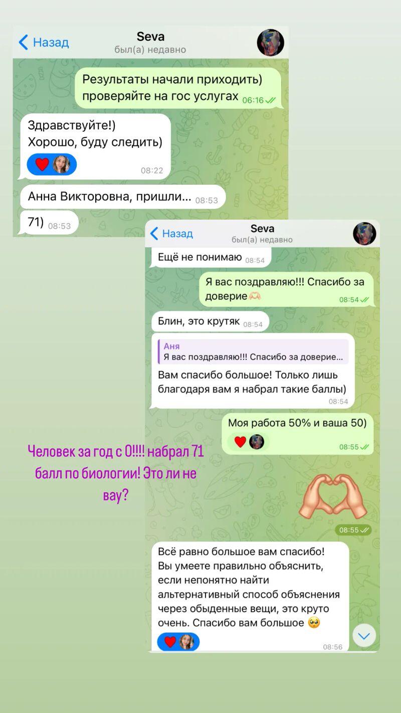 Анна Викторовна подготовила моего сына к ЕГЭ по биологии с нуля за полгода, и он получил 67 баллов. Мы очень довольны результатами. Сыну было легко общаться и учиться с Анной. Мы бесконечно благодарны ей!